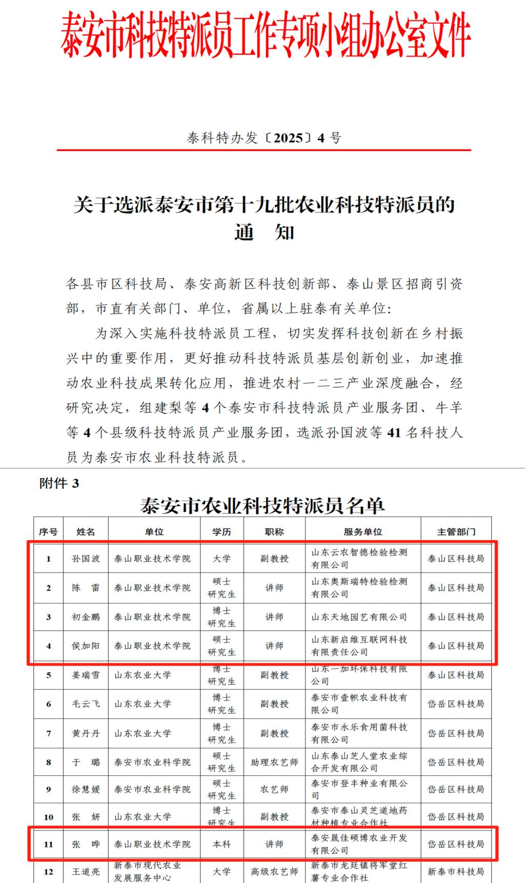 近日,泰安市科技特派员工作专项小组办公室公布第十九批农业科技特派员名单,我校孙国波、陈雷、初金鹏、侯加阳、张晔5位教师成功入选。