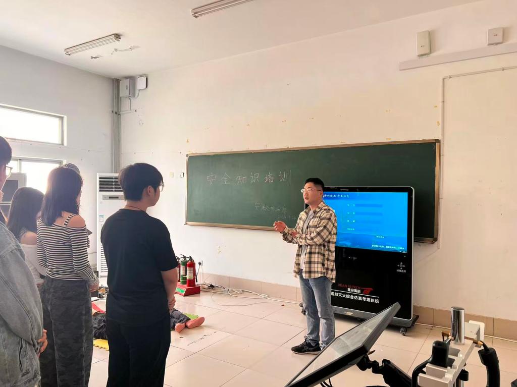 安全教员李老师结合实验室智能设备讲解了灭火器的使用方法,重点强调"压力表、软管及喷管前端"三项关键指标开展设备检查,详细示范了"提、拔、握、压"四步操作法。现场指导学生运用虚拟灭火综合传真设备及智能化考培系统模拟灭火器的选择和使用,细化教室、实验室等多场景火灾状态下的灭火方法。
