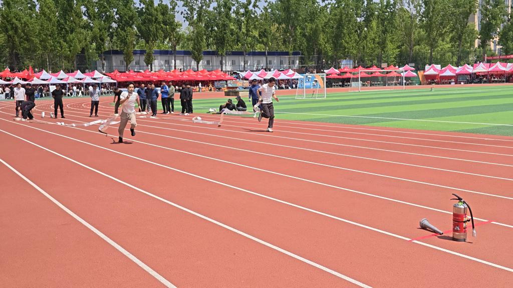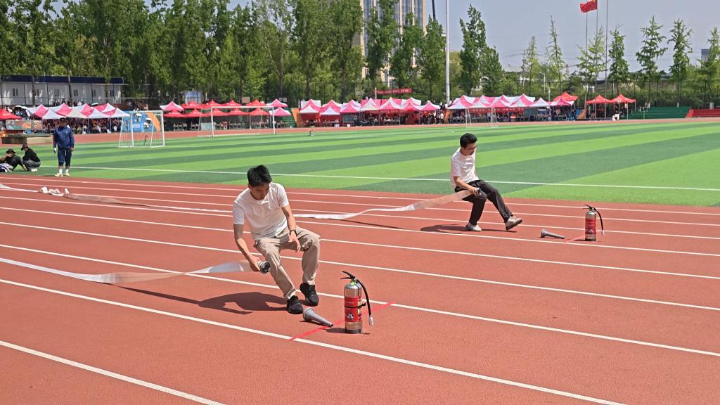 春风和煦,阳光宜人。2026年4月23日,学院春季田径运动会创新性地推出“50米水带连接接力及模拟灭火竞赛”,巧妙地将消防技能与运动竞技相融合,吸引教职工队伍踊跃参与。