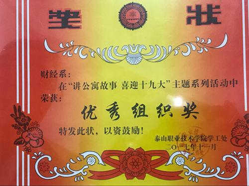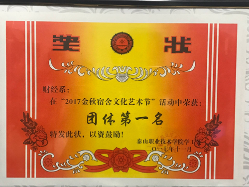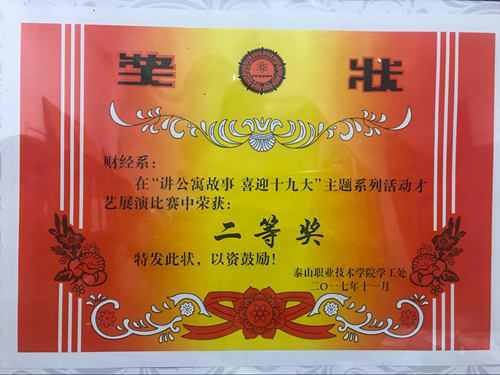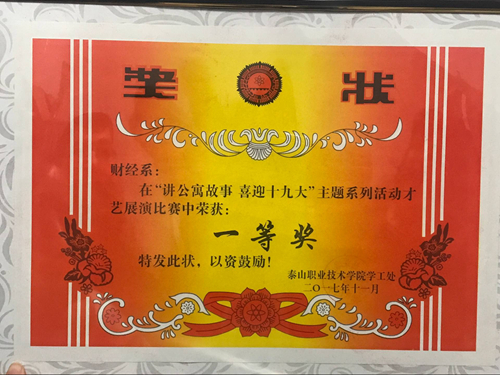 11月27日下午, 泰山职业技术学院在图书馆报告厅内举行2017金秋宿舍文化艺术节暨“讲公寓故事 喜迎十九大”系列活动表彰大会,财经系在“讲公寓故事,喜迎十九大”主题系列活动才艺展演比赛荣获:一等奖,二等奖。
