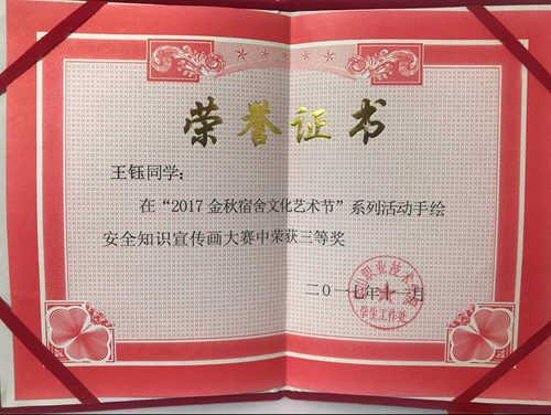 王钰同学在“2017金秋宿舍文化艺术节”系列活动手绘安全知识宣传画大赛中荣获:三等奖。