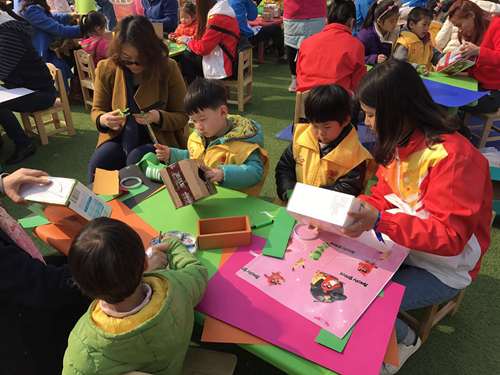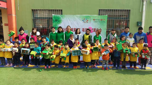 本次活动是将平时废弃的快递盒进行DIY创意设计,废物回收利用。经过幼儿园老师的讲解,小朋友们发挥自己的奇思妙想,我们的志愿者们协助小朋友们剪纸、染色、贴包装纸。经过一上午的忙碌,在志愿者和小朋友的共同努力下,一件件作品诞生了,有青蛙、装饰物……活动最后进行了作品展示,捧着一件件作品,小朋友们情不自禁的欢呼起来。