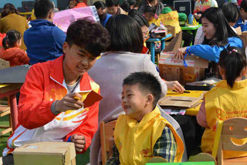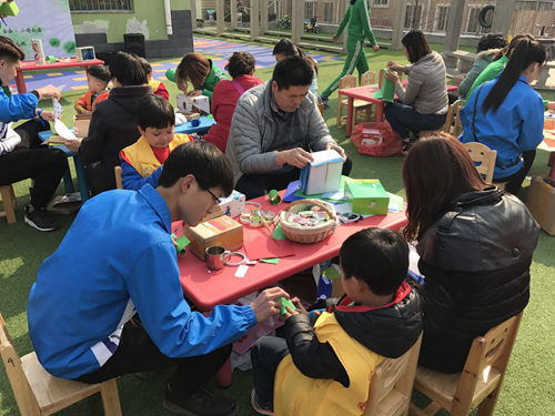 在学雷锋纪念日到来之际,3月4日,财经系志愿者服务队来到泰安青山家园参与由泰山小荷公益举办的“盒家欢”环保项目交流展示会。