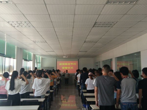 5月18日组织本系2016年国家助学贷款学生150余人在居正楼举办“诚信励志节约”宣誓仪式,教育受资助学生树立勤俭节约意识,强化节约光荣、浪费可耻的观念。5月22日在明德楼悬挂印有“厚德能载物 诚信赢天下”等相关内容的条幅,在全系进行宣传,形成良好氛围。5月22日晚自习组织各班召开主题班会,班长为同学们展示了相关ppt,并向同学们阐述了诚实守信,勤俭节约的重要性,随后同学们展开积极讨论,并通过个人演讲,发言互动的方式来表达自己对勤俭和诚信的思考和心得。最后班长向全体同学发出倡议,从自身做起,从生活点滴做起,诚实守信,勤俭节约。