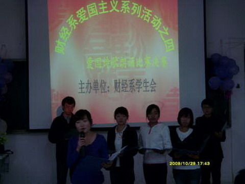系列活动之一“我爱我的祖国”诗歌朗诵比赛在2009年10月29日下午4点502合堂教室举办。听着各班参赛者的一篇篇激情澎湃的赞歌,同学们都感动不已,现场高潮迭起,同学们激情的诵读着对祖国的热爱与自豪,赞美着改革开放好、社会主义好、共产党好的激越豪迈之情。