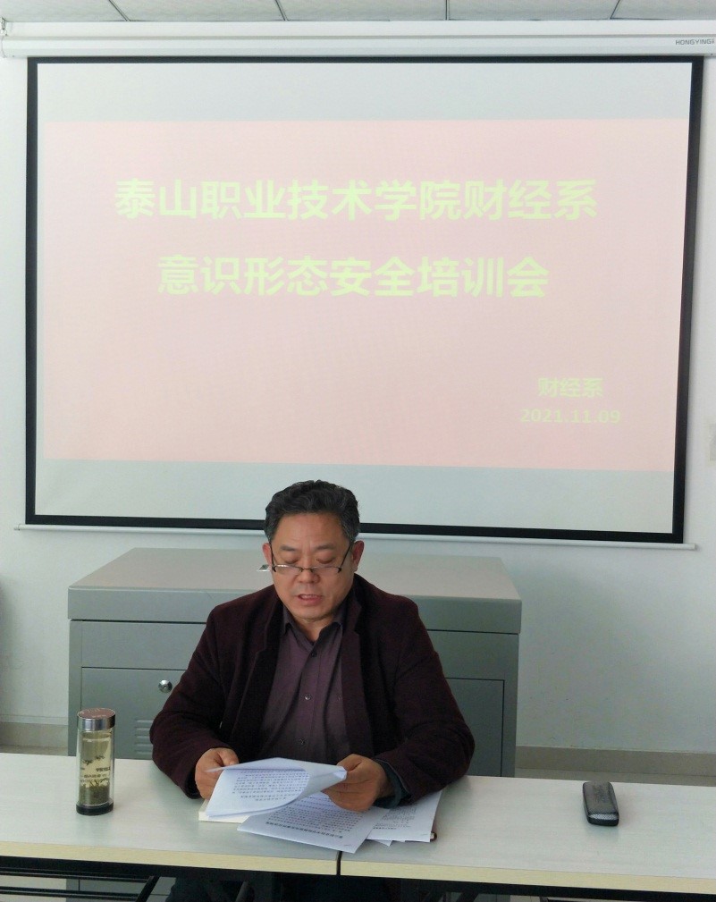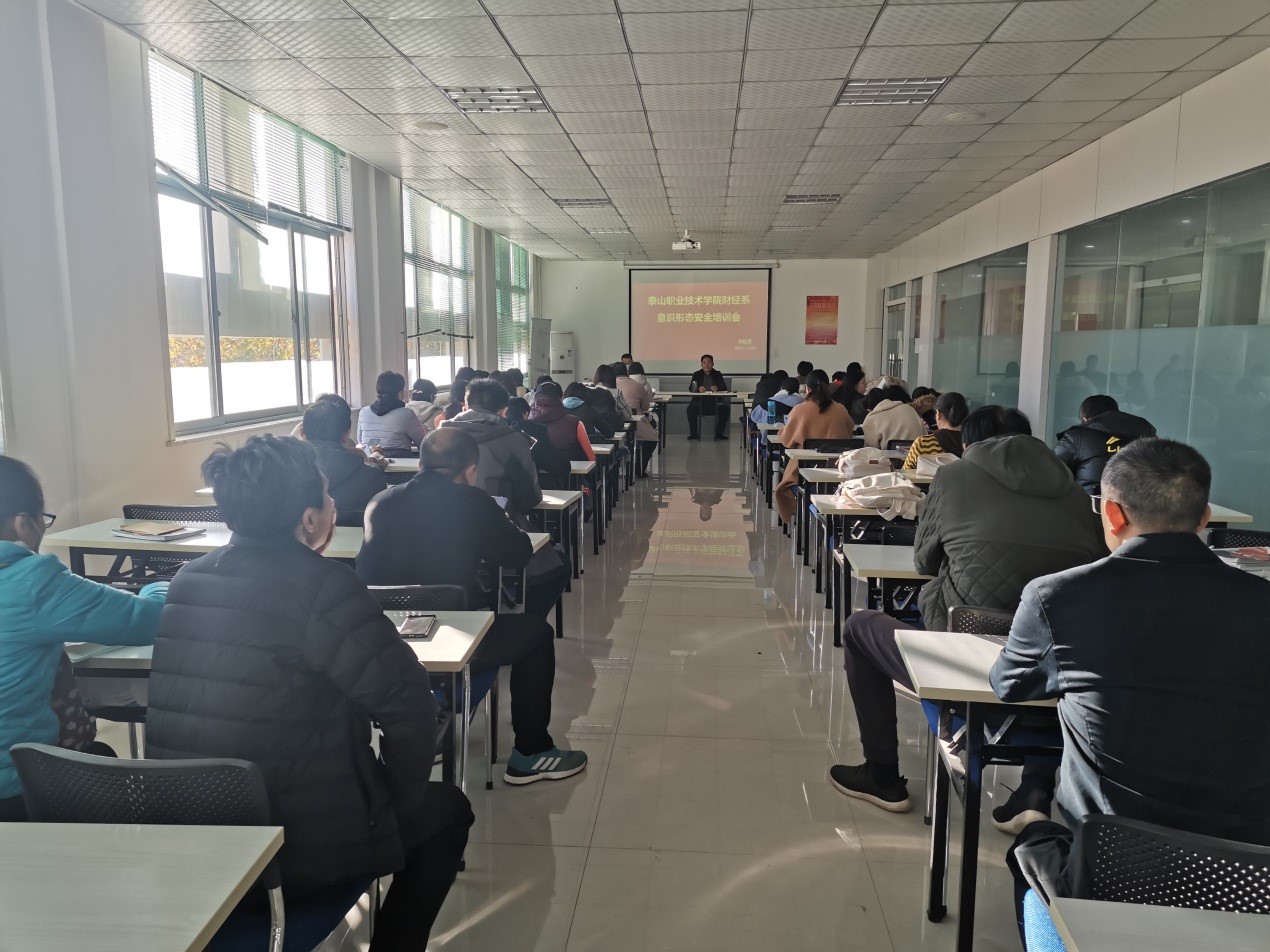 2021年11月9日下午,为深入贯彻习近平新时代中国特色社会主义思想和党的十九大精神,贯彻落实习近平总书记关于加强意识形态工作的论述,进一步做好财经系意识形态工作,及时规范处理突发事件,财经系召开意识形态安全培训会,会议由财经系主任李金伟主持,全体教师教师参加。