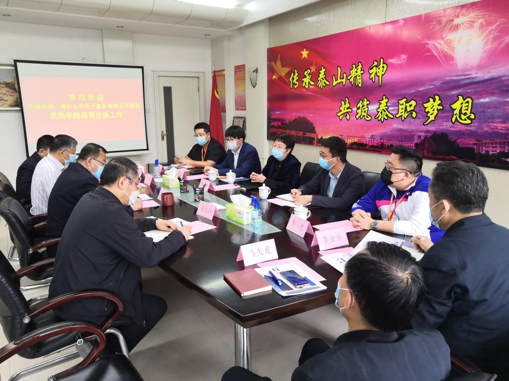 参观结束后,双方在致远楼二楼会议室开展了洽谈工作。柳桂敏介绍了全市电子商务发展情况,对学院在电子商务方面的发展提出指导建议。赵彦彬介绍了公司的发展历程、人才需求和人才培训等情况,表达了和我院进行校企合作的意向。张勇华强调,学院主动服务泰安经济发展,为服务新型工业化强市战略,建立了21条对应市重点产业的专业链,培养优秀高素质技术技能型人才。张勇华建议,校企双方下一步可以在人才培养方案制定、课程体系建设、“订单班”培养、实习就业、产业学院共建等方面开展深入合作,共同打造校企合作典范,为泰安经济社会发展贡献力量。毕于民介绍了学院办学历史、办学条件、办学成绩等基本情况,对校企双方开展多层面合作表示欢迎和支持。