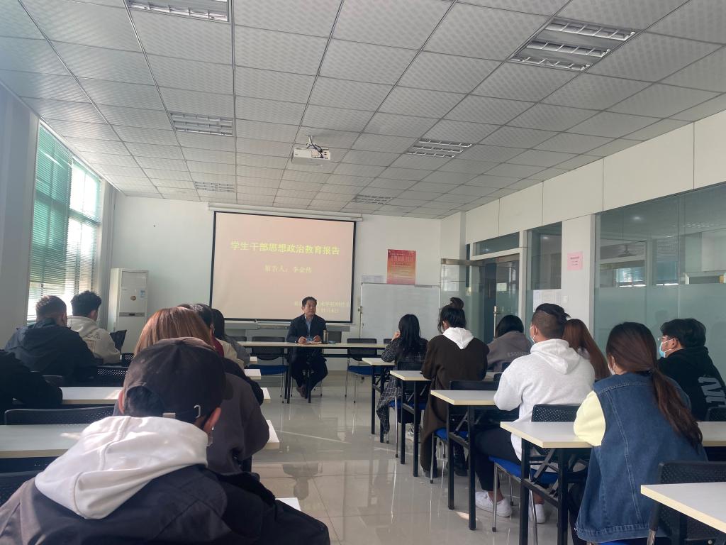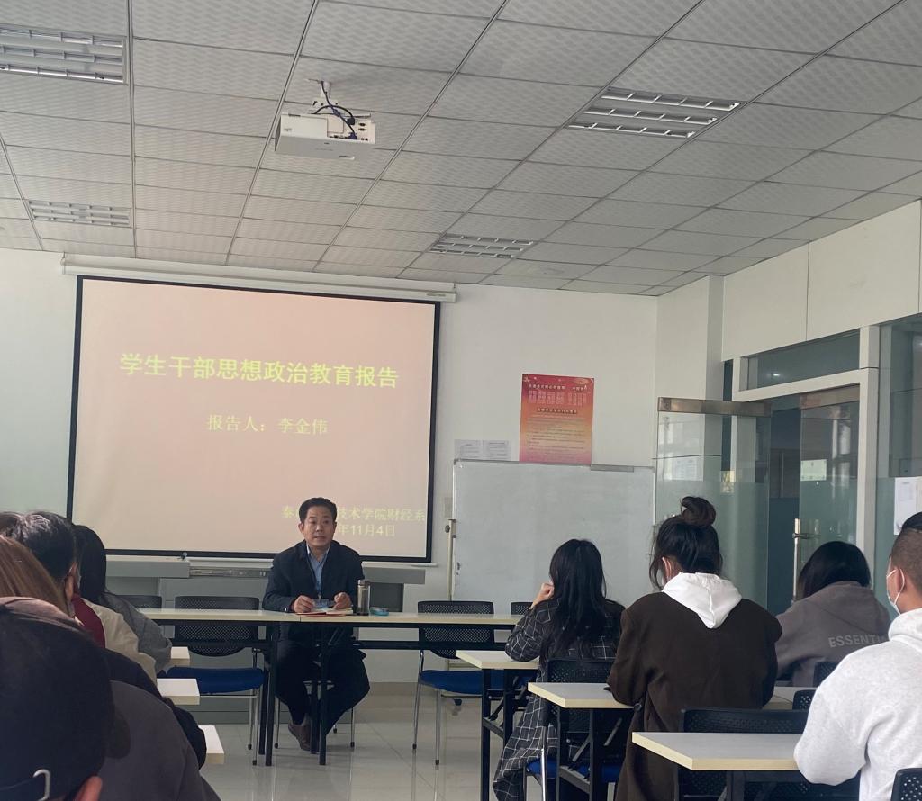 2022年11月4日,泰山职业技术学院财经系举办学生干部思想政治教育报告会,报告会由财经系主任李金伟主讲,副主任王桂珍、副主任张建明以及财经系2022届全体学生会干部参加。