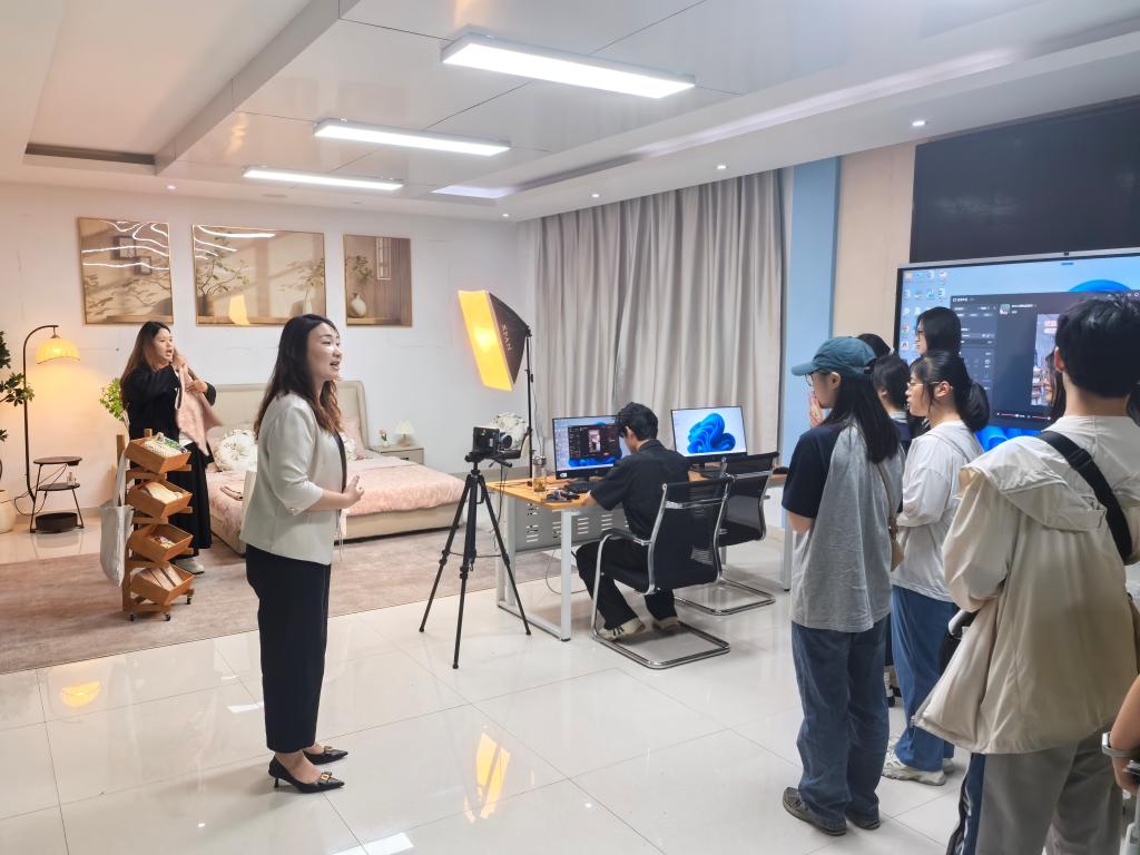 财经系学生以班为单位依次体验“泰山大樱桃”助农直播间、“裕泰源麻业”直播间,高倩倩老师为大家介绍了直播的流程及注意事项,在“裕泰源麻业”直播间,学生化身非遗文化推介官,深入挖掘鲁绣工艺价值;“泰山大樱桃”助农直播间则考验团队即时控场和促销策略制定能力。学生以真实企业项目为“练兵场”,深度体验直播全流程,实现“课堂”与“产业”的零距离碰撞。