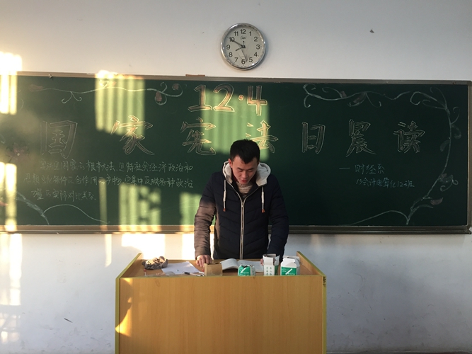 为加强法制教育宣传,增强学生的自我保护意识,让学生养成学法、懂法、依法办事的好习惯,有效地树立和维护学校良好的学风以及社会的稳定发展。11月30日,财经系各班召开"学习宪法精神,弘扬宪法精神"主题班会。班会上,班长通过案例分析引导同学们参与讨论事例。同学们在热烈的讨论中增强了法律意识,学会了正确的自我保护的方法,规范了自身的行为道德。本次班会旨在使每位同学能系统的掌握宪法的相关知识,了解宪法在法律体系中地位,初步掌握和应用宪法的知识,让同学们对宪法有较为全面的了解。