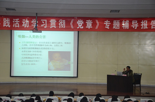大会一开始,卢所长从控烟的背景、吸烟的危害、我国控烟工作的进展情况等方面,客观讲述了烟草的危害和在我们国家存在的严重程度,让大家充分认识到吸烟的危害和控烟的意义,倡导同学们要养成不吸烟的好习惯。随后,卢所长还针对当前生活节奏加快、生活压力加大所带来的一些不良生活习惯导致的亚健康,从医学角度为大家讲授了一些保健知识。