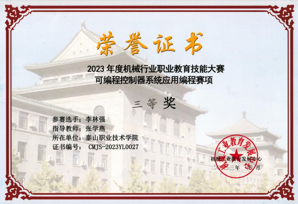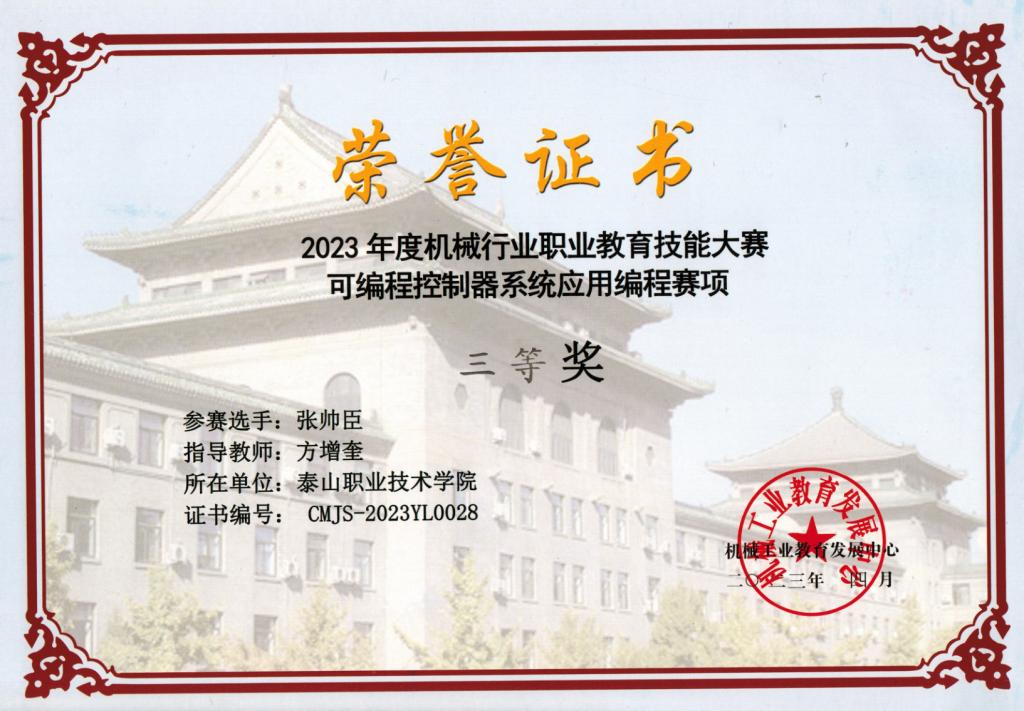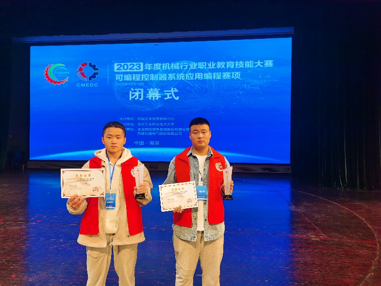 近日,2023年度机械行业职业教育技能大赛“可编程控制器系统应用编程”赛项在南京工业职业大学举行,全国共有99支高职队伍参赛,经过激烈角逐,由汽电系方增奎老师指导的张帅臣同学和张学燕老师指导的李林强同学分别荣获三等奖。