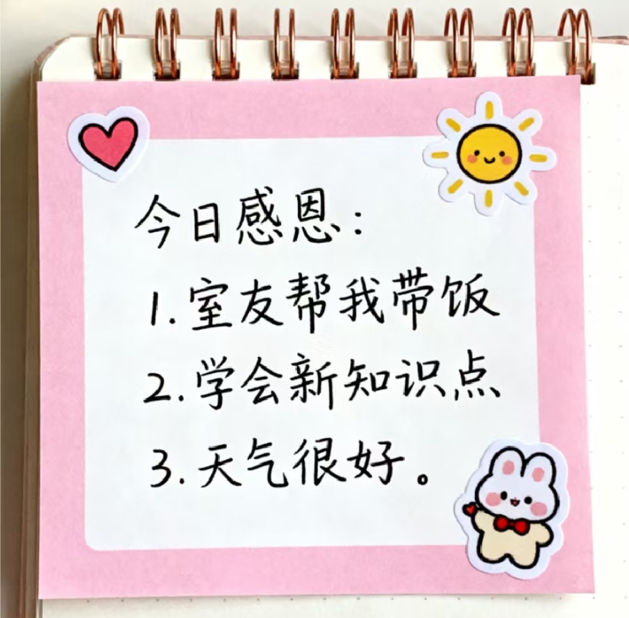 →每日感恩:每天睡前感恩3件事,比如“今天室友帮我带了饭”、“今天学会了一个知识点”、“今天天气很好”,珍惜当下的小美好,才能吸引更多美好。
