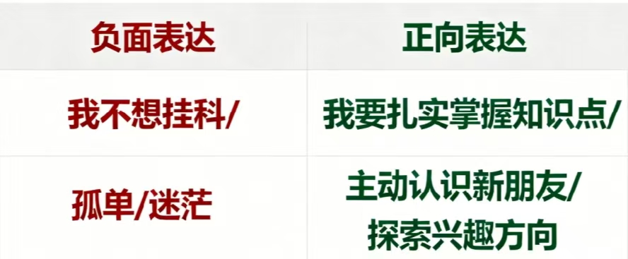❌ “我讨厌迷茫” → ✅ “我要在本学期找到3个职业方向”