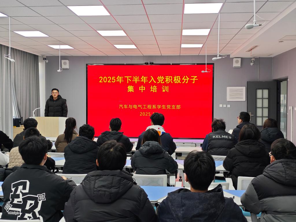 为扎实推进党员发展工作,强化入党积极分子思想理论武装,筑牢理想信念根基,12月17日,汽车与电气工程系学生科副科长张酉晨、辅导员马彬于智能制造大楼C503组织系部内全体入党积极分子集中培训。