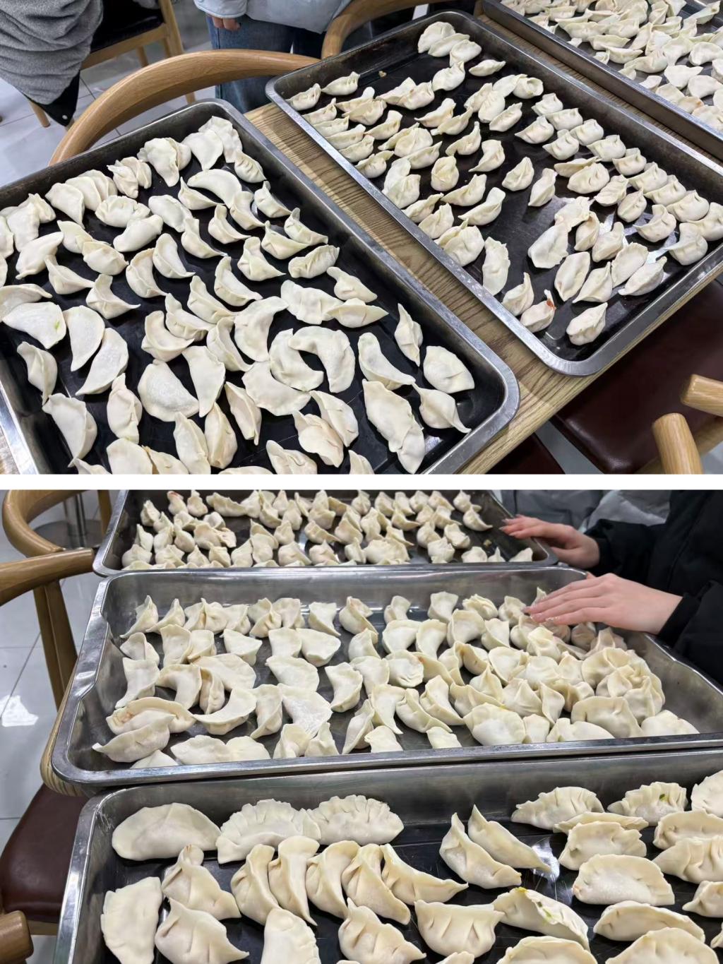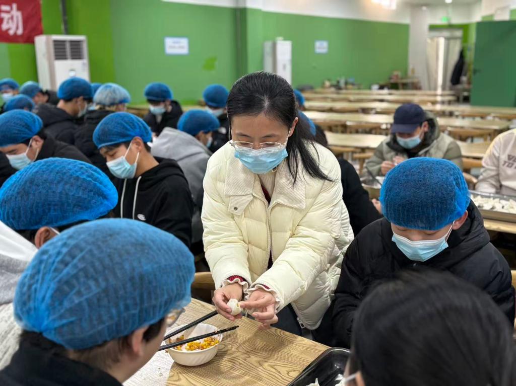 活动现场热闹非凡,师生们分工协作、各显身手,揉面、擀皮、包饺子一气呵成。新入职的老师们很快融入氛围,和同学们边唠家常边分享技巧,煮熟的饺子热气腾腾,鲜香四溢。