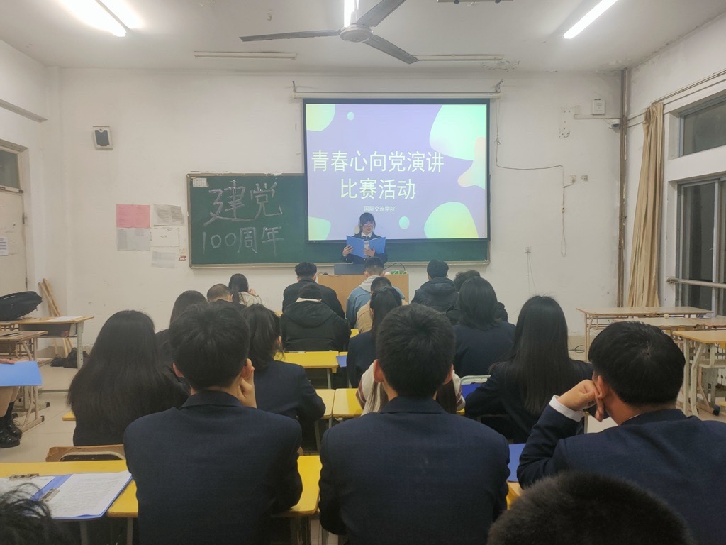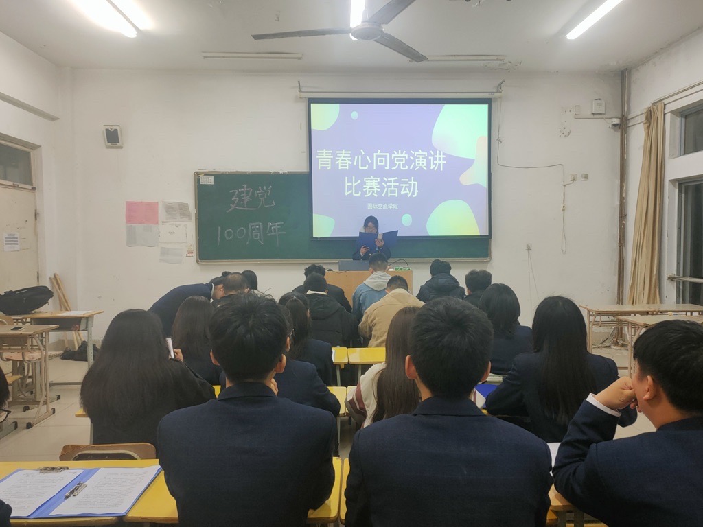 为隆重庆祝中国共产党建党100周年,重温党的光辉历程,歌颂党的伟大成就,继承和发扬党的优良革命传统,充分展示当代大学生的爱党爱国爱社会主义的深厚情怀,国际交流学院学院举办“青春心向党”主题演讲比赛,并以此为契机,激励同学们学习党的历史,在咀嚼苦难中坚定人生信仰,在缅怀先烈中树立人生榜样,在回顾险阻中培育斗争精神。