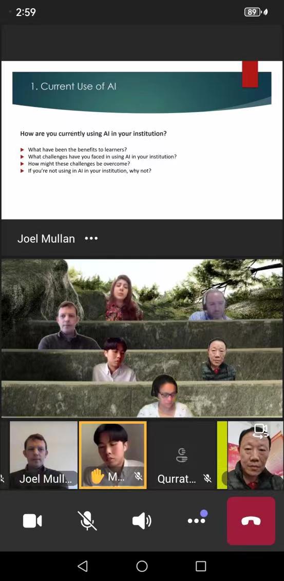 此次线上会议由Joel Mullan主任和 WFCP项目管理员Lyne Dalby主持,会议依次从目前人工智能的使用、未来人工智能的使用、使用人工智能的准备、人工智能使用的伦理层面四个方面中的多个问题进行了多方面的、多角度的、多层次的交流、分析和讨论。随后,与会专家们就如何在学习、教学和机构管理中利用人工智能进行探讨,专家们各抒己见,充分探讨了人工智能在PTET领域中的应用和存在的问题。最后由Joel Mullan主任和 WFCP项目管理员Lyne Dalby总结了各参会人员对所提问题的发言,初步拟定了一个行动议程,并对所有参会人员表示了深切的感谢。