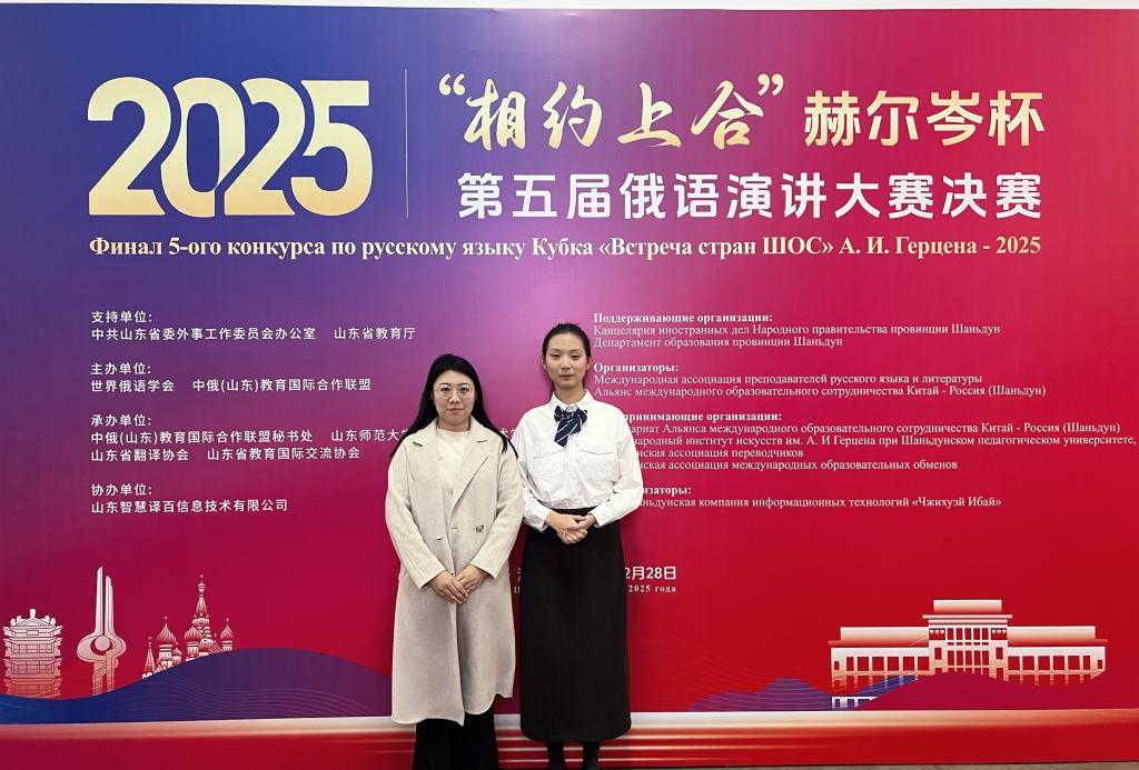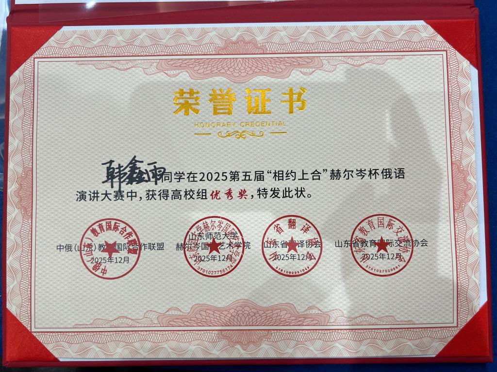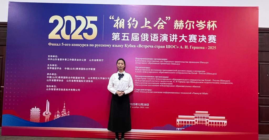 12月28日,第五届 “相约上合” 赫尔岑杯俄语演讲大赛决赛在山东师范大学圆满落幕。国际交流学院25级应用俄语专业韩鑫雨同学荣获高校组优秀奖,指导教师为陈彤。