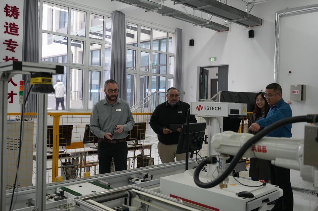 在随后的教学研讨与实地考察中,双方团队围绕教学策略优化及多元化评价进行了深度交流。克雷格·弗兰克·希尔一行实地走访了智能制造大楼、PLC及机器人实训中心,重点对我校实训合规性材料进行了收集与评估。澳方专家对我校严谨的教学管理及高度契合TAFE标准的实训环境给予了高度评价,认为这为培养具备国际竞争力的技术技能人才提供了坚实保障。