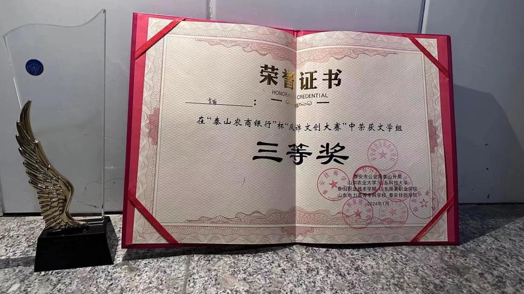 国际交流学院贾楠同学获得泰安市高校“反诈”文创大赛三等奖