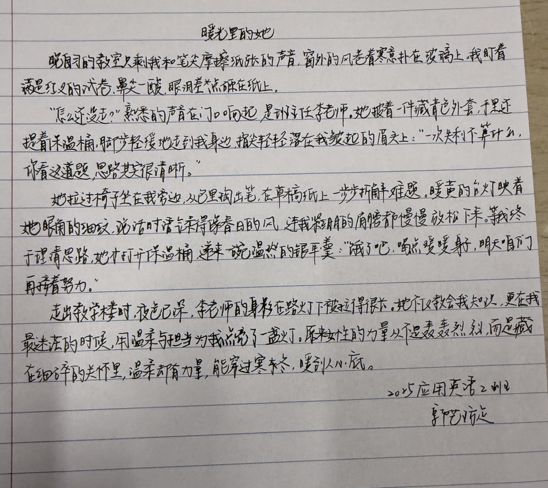 活动中,同学们积极捕捉生活中的温暖印记:或是跨文化交流中陌生与熟悉的碰撞;或是求学路上同窗挚友的暖心扶持;或是师生间温柔的教诲与陪伴;又或是独处时与自我和解的成长瞬间。他们用细腻的文字定格生活暖意,传递内心力量。