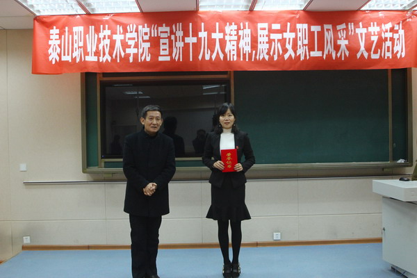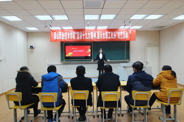 12月13日下午,我院在图书馆录播室举行“宣讲十九大精神,展示女职工风采”文艺活动,通过诗歌集体朗诵、演讲比赛等形式展开。学院党委委员、工会主席李敬海,基础部、工会、宣传处和学院语文教师等5位思政、文史专业教师担任评委。