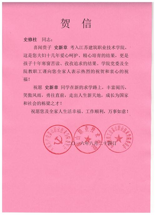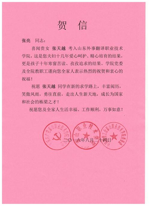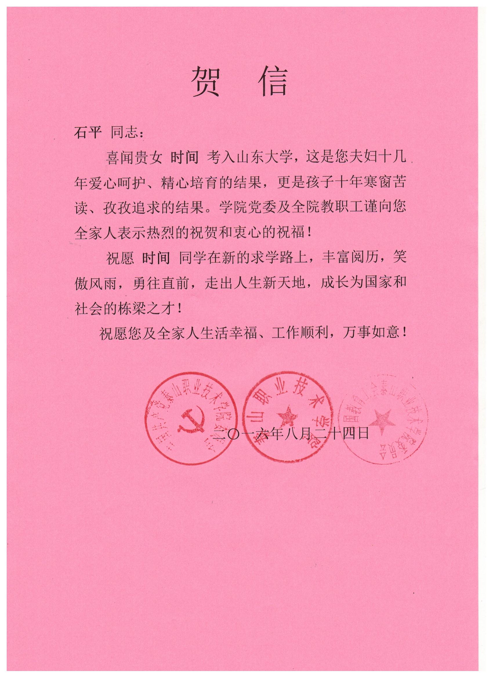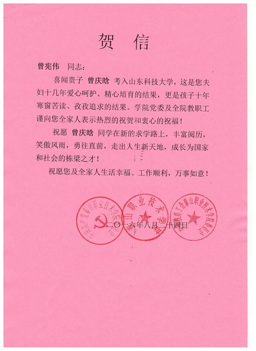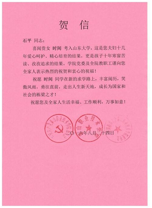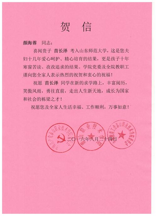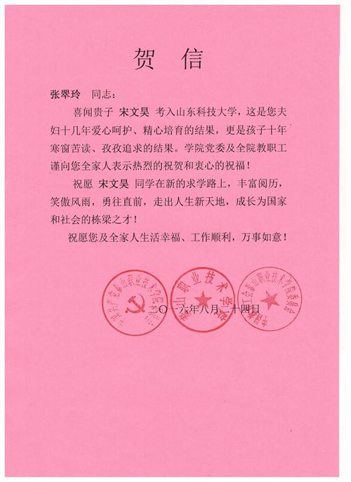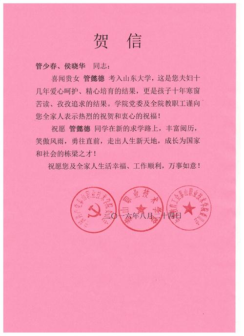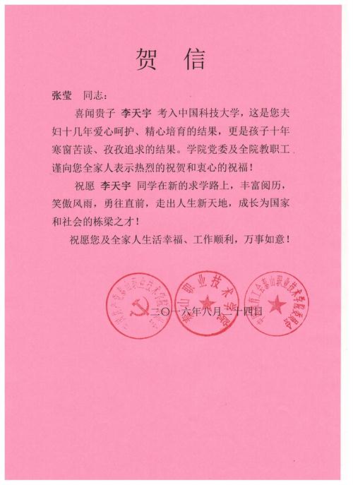 十年寒窗日,金榜题名时。为了体现学院和工会对教职工及其家庭的关心,鼓励教职工子女好好学习,努力成为国家的栋梁, 8月24日,我院工会向2016年通过全国普通高考考入大专以上院校的11名在职职工子女和含辛茹苦培养他们的家长们发放了贺信,表示热烈的祝贺和慰问。