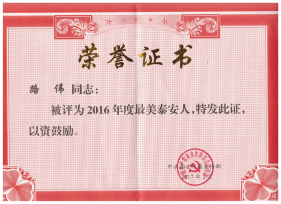 祝贺路伟同志荣获2016年“最美泰安人”荣誉称号