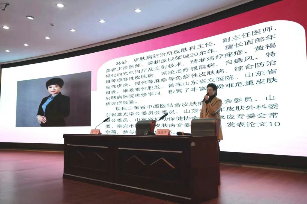 活动特邀岱岳区皮肤病医院皮肤科主任、副主任医师、美容主诊医师马云及其团队莅临现场。马云主任深耕皮肤领域超20年,曾于山东省立医院、山东省皮肤病医院进修,积累了大量疑难危重皮肤病诊疗经验,现任山东省中西医结合皮肤病委员会委员等多个专业组织委员或常委。讲座环节,她以“靓丽青春·肤护健康伴我行”为核心,围绕湿疹、疱疹、痤疮等皮肤病的成因、诊断、日常护理及专业治疗等方面展开详细讲解。从皮肤病产生的根源剖析,再到科学护理方法的传授,内容深入浅出,实用性极强。