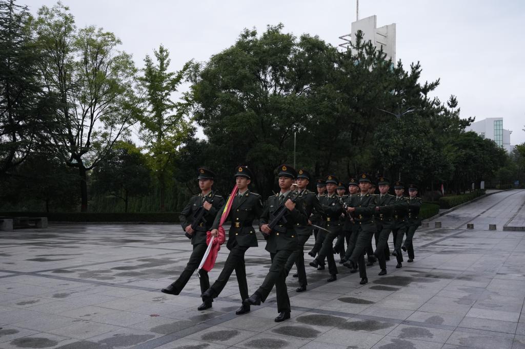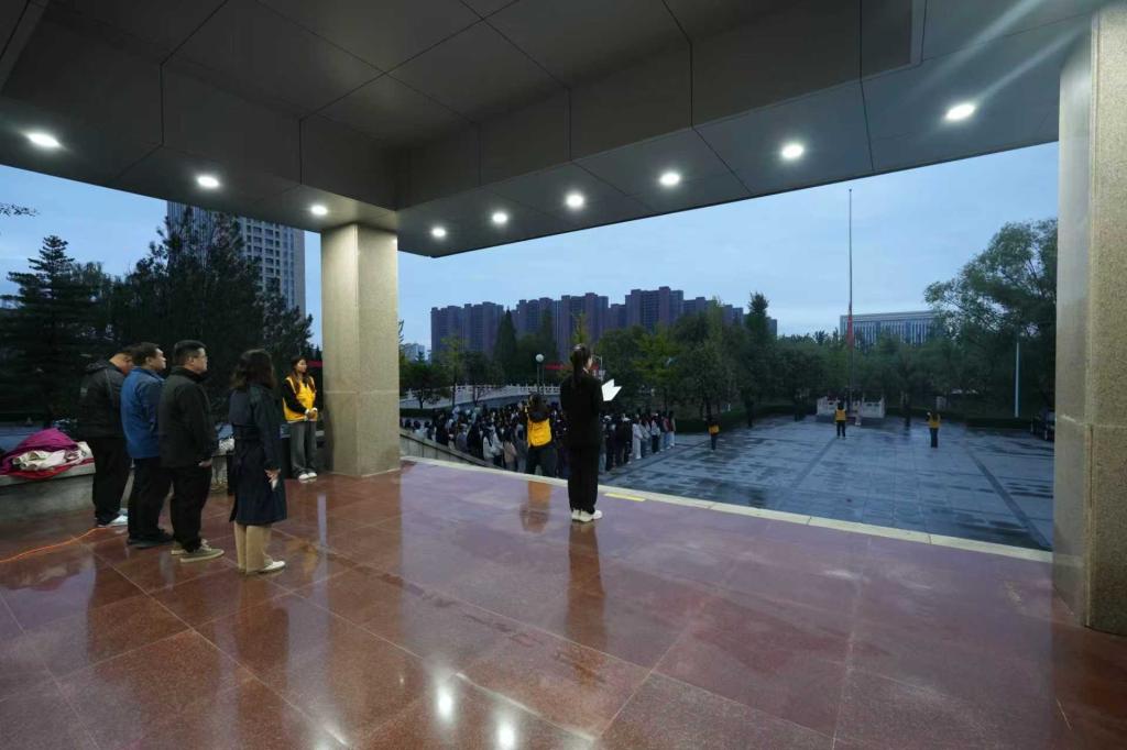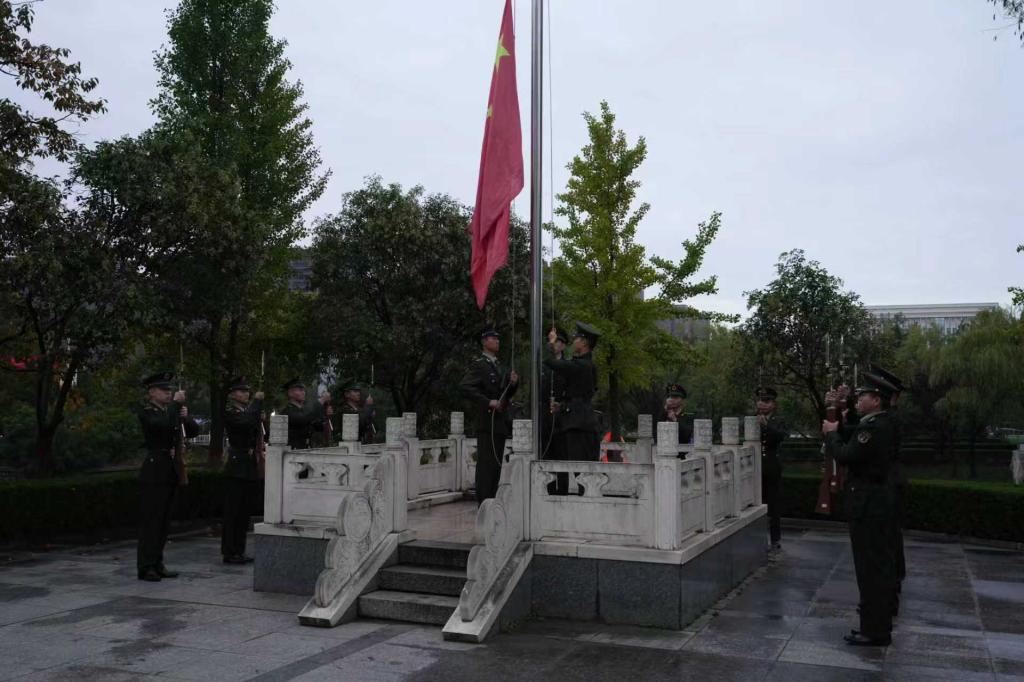 伴随着激昂的《义勇军进行曲》,国旗护卫队肩扛礼宾枪,迈着铿锵有力的正步走向升旗台。五星红旗冉冉升起,全体人员肃立行注目礼,高唱国歌,目光紧紧追随国旗,爱国情怀与节粮意识在晨光中交融。