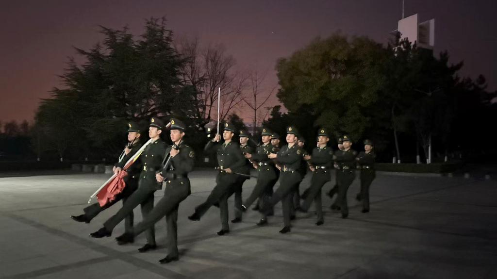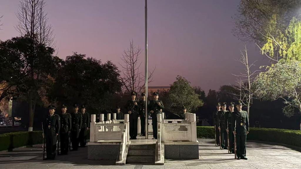 一声响亮的“正步走!”划破清晨校园的宁静,国旗护卫队步伐铿锵、身姿挺拔,迈着沉稳有力的步伐护送国旗走向升旗台,当激昂的《义勇军进行曲》响起,五星红旗迎着晨光缓缓舒展升起,全体师生庄严肃立,齐声高唱国歌,目光紧紧追随国旗,整齐的队列与昂扬的神情,尽显蓬勃向上的精神风貌。