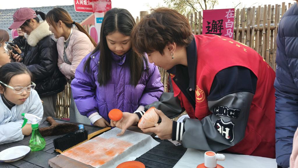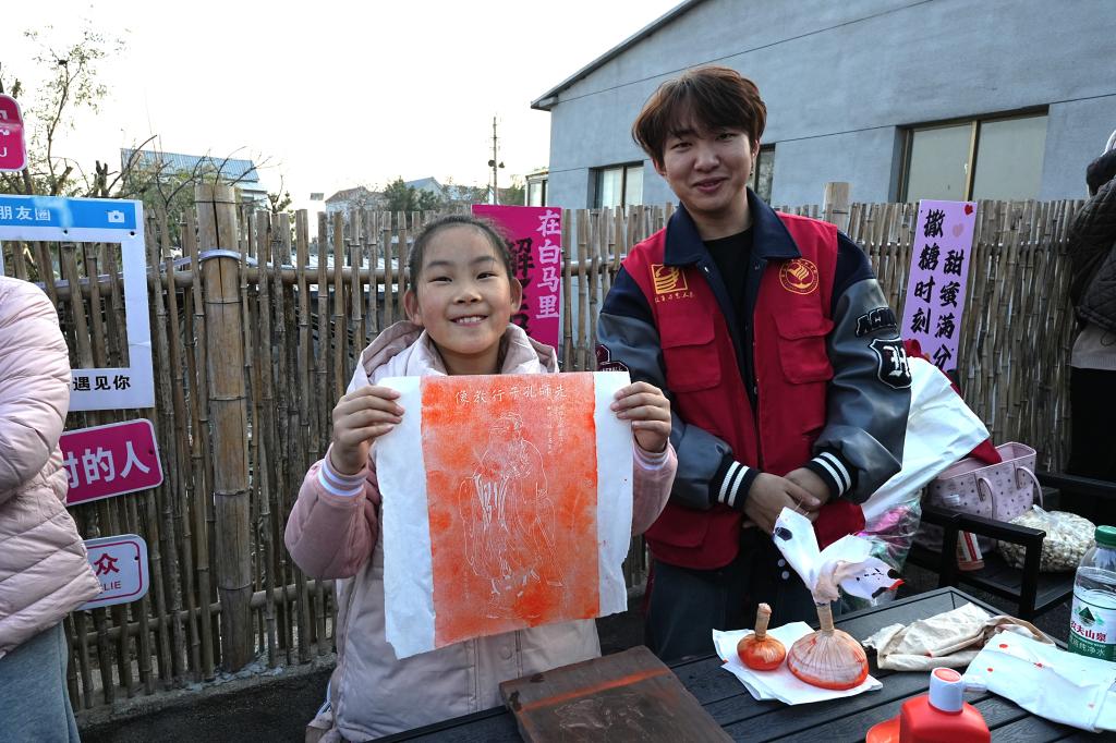 舞台之外,非遗体验区与文创市集热闹更胜往昔,学生们带着观众上手体验石刻拓印、书法与中国扇等,指尖起落间让非遗“活”在当下,这一次,学生们的设计巧思与乡土元素碰撞出独特韵味,即体现了他们的专业技能,也为白马石村的文化传播添了青春注脚。
