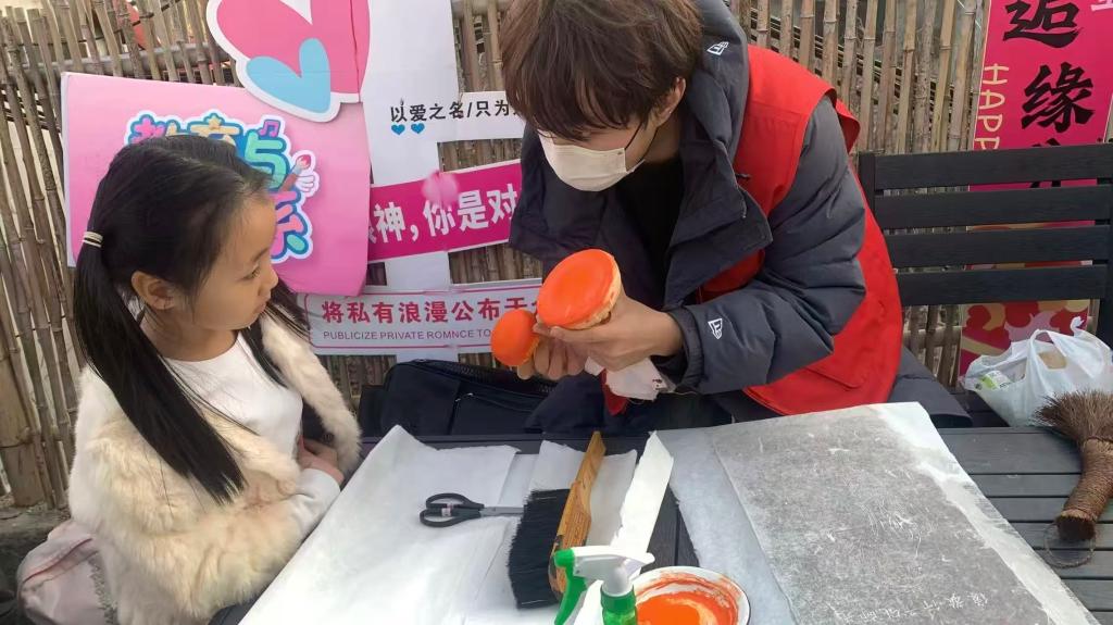 与舞台相呼应的非遗体验区与文创市集同样是人气聚集地,教育与艺术系同学们带着材料引导观众们制作石刻拓印、创作书法扇,非遗技艺在指尖流转。文创市集的各类作品前,村民驻足挑选,创意与烟火气在此交融。