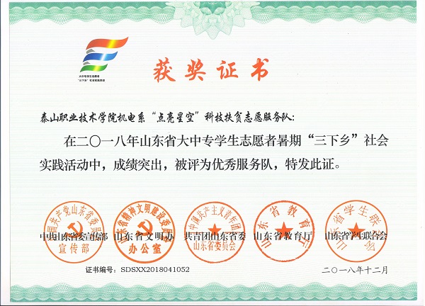 近日,中共山东省委宣传部、山东省文明办、中共山东省委高校工委、共青团山东省委、山东省教育厅和山东省学生联合会联合下发《关于表彰2018年山东省大中专学生志愿者暑期文化科技卫生“三下乡”社会实践活动先进集体和先进个人的通报》,我院机电系“点亮星空”科技扶贫志愿者服务队荣获“2018 年山东省大中专学生志愿者暑期‘三下乡’社会实践活动优秀服务队”称号,杨兆伟、侯加阳荣获“优秀指导教师”称号,于月洋等4名该团队志愿者荣获“优秀学生”称号。