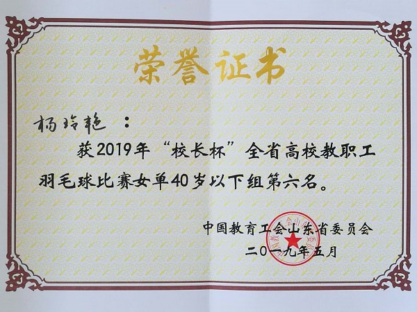 5月27日至5月31日,2019年“校长杯”全省高校教职工羽毛球比赛在鲁东大学举行,我院荣获体育道德风尚奖。