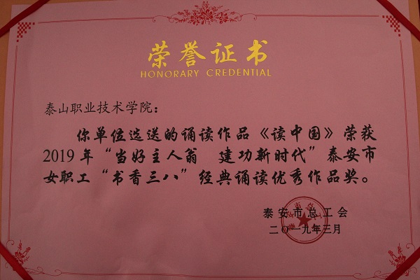为弘扬中华民族传统美德,鼓励女职工们“当好主人翁,建功新时代”,近日,泰安市总工会举办“书香三八”经典诵读展演活动。我院财经系选派女教师代表参加,并获得优秀作品奖。