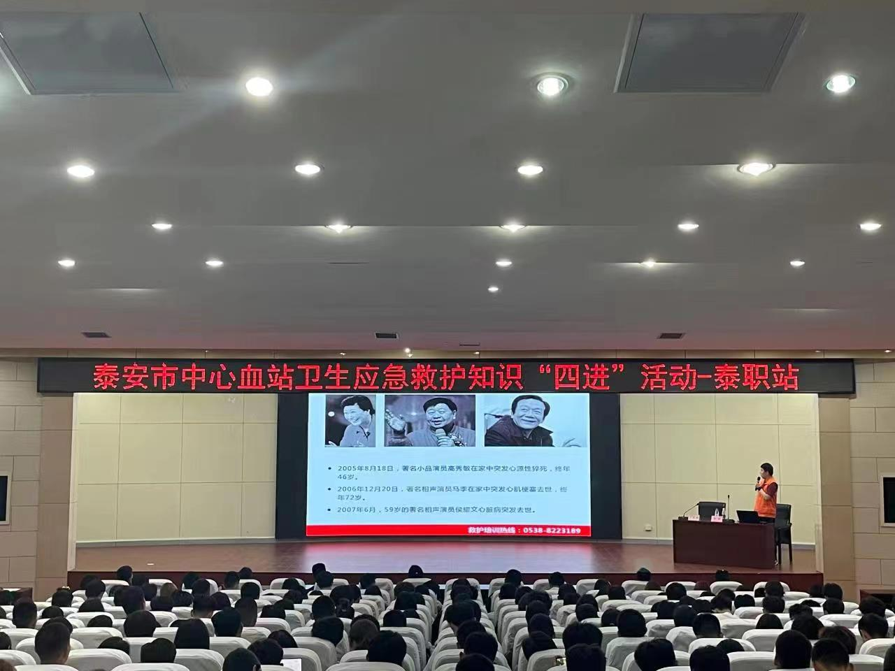 为深入学习贯彻党的二十大精神,泰安市卫生健康委按照上级统一部署安排,全面启动泰安市卫生健康系统解决群众急难愁盼问题百日攻坚行动暨“四进”健康促进行动。6月1日,泰安市中心血站卫生应急救护知识“四进”活动在我院图书馆报告厅举办,财经系副主任王桂珍主持活动。各系老师代表,学生代表共计400余人参加。