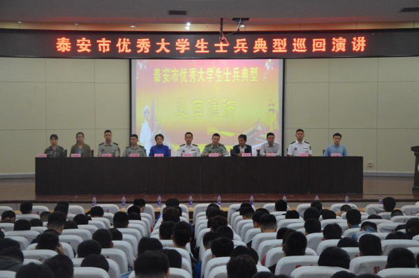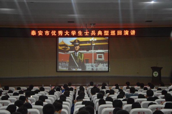 为深入贯彻习近平主席给南开大学新入伍大学生回信精神,进一步强化大学生国防观念,激发大学生参军入伍热情,5月21日下午,由泰安市军分区主办的“泰安市优秀大学生士兵典型巡回演讲”活动在我院图书馆报告厅举行。泰安市军分区、泰山区武装部有关领导,学院党委委员、副院长张小烨,党委委员、工会主席李敬海及有关处室负责人、学生代表500余人参加。