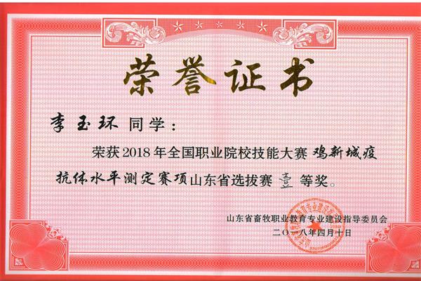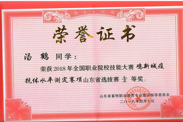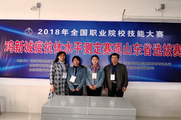 近日,我院生物系畜牧兽医专业汤鹤、李玉环两位同学在2018年全国职业院校技能大赛“鸡新城疫抗体水平测定”赛项山东省选拔赛中荣获一等奖,顺利晋级国赛。