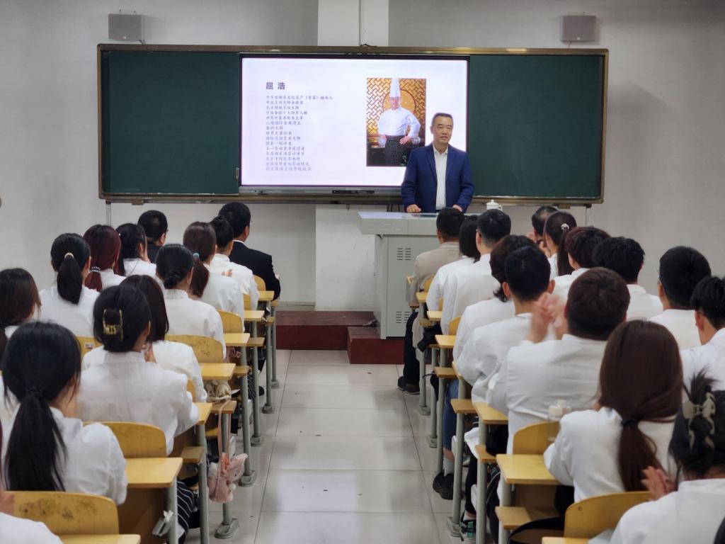屈浩作为特聘大师发表致辞,他结合多年从业经历,深谈了对该专业人才培养目标的认识理解,表示将为推进当前和未来餐饮行业发展人才教育积极贡献自身力量。