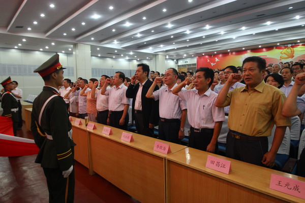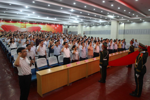 马培安带领全体教职工宣誓做“四有型”好老师,张清民宣读学院表彰决定。