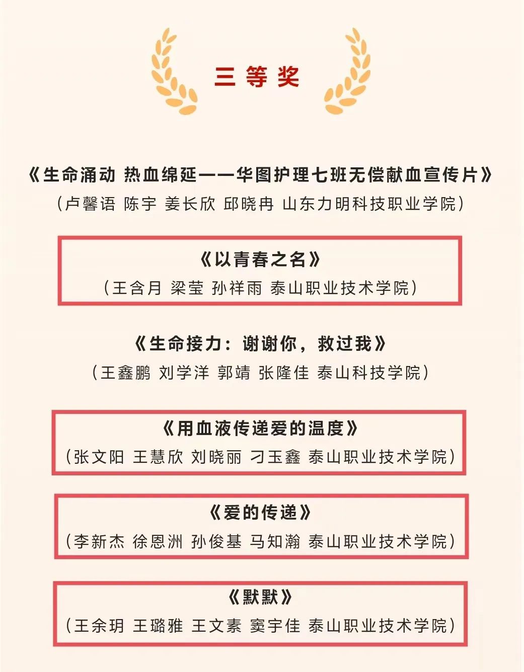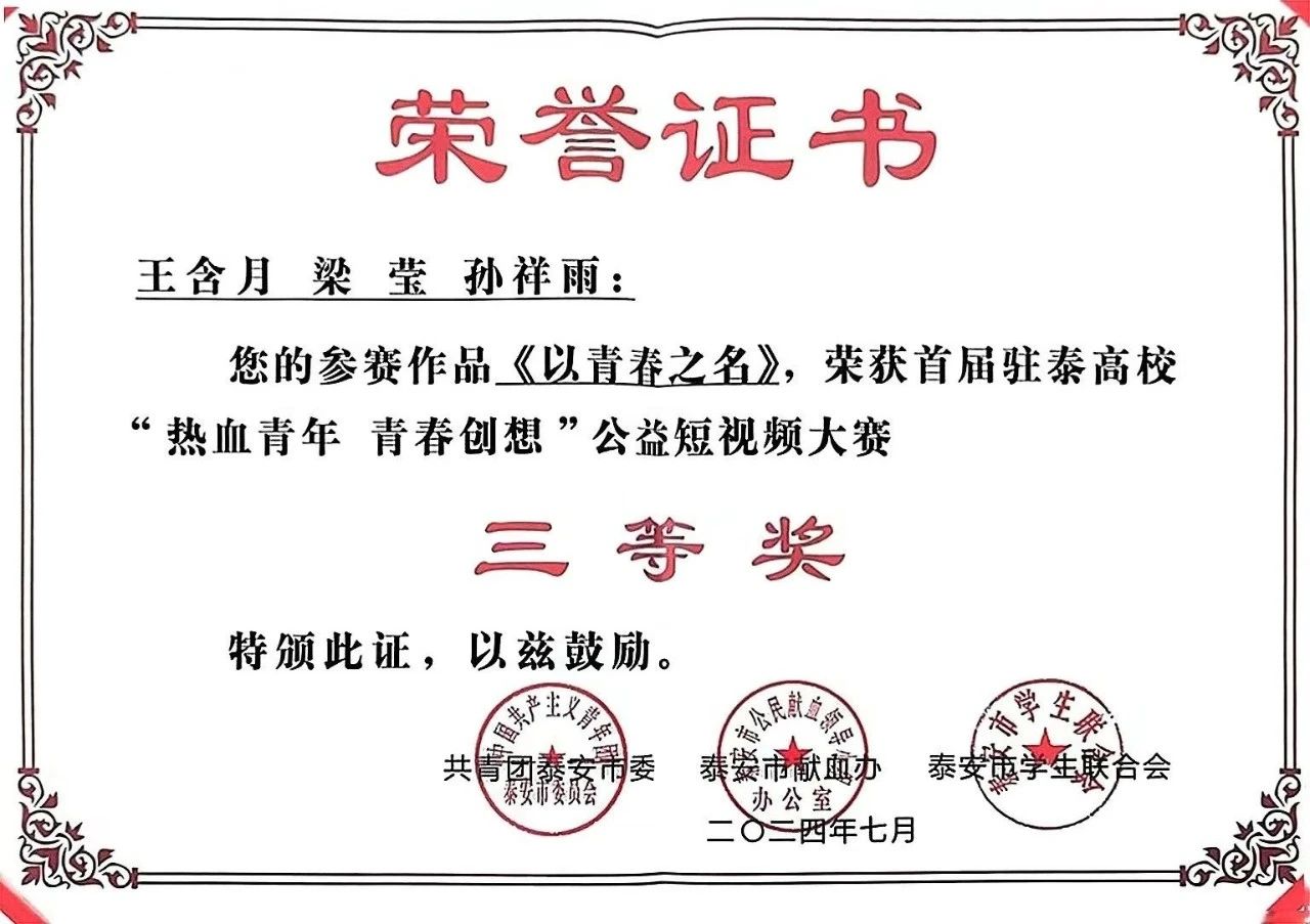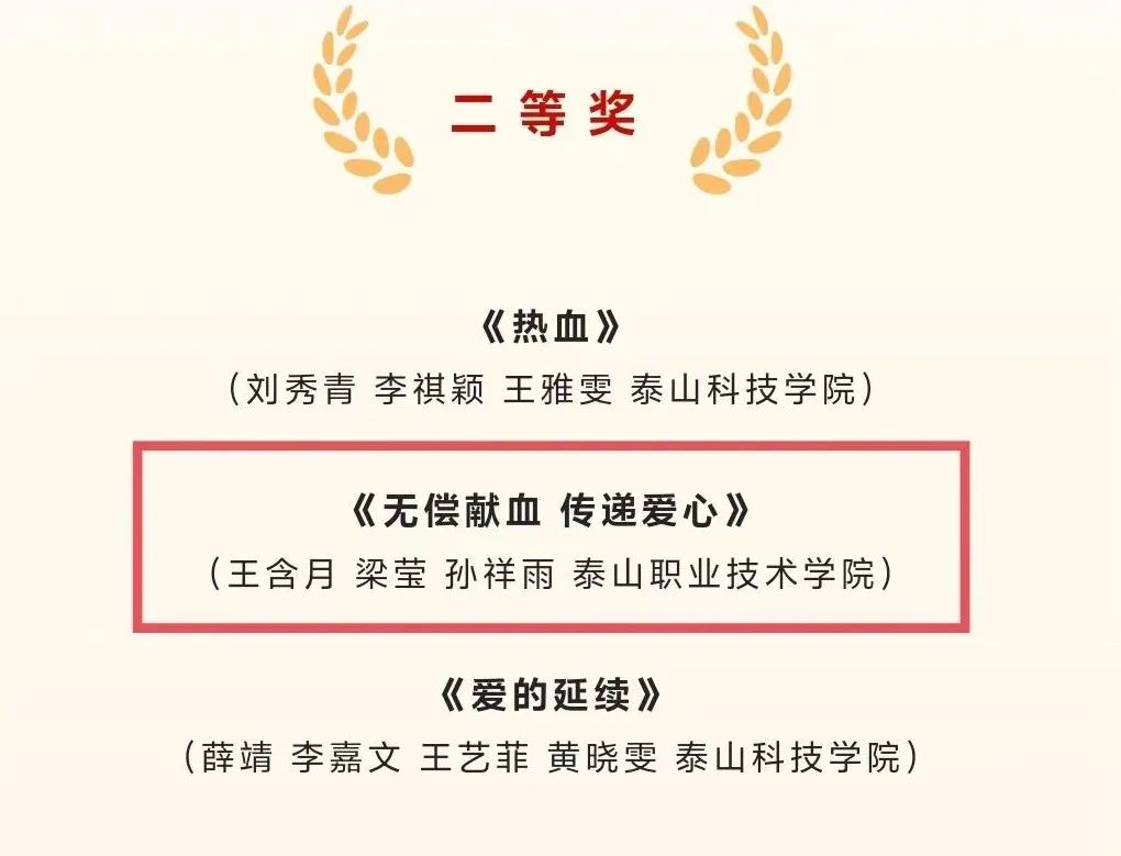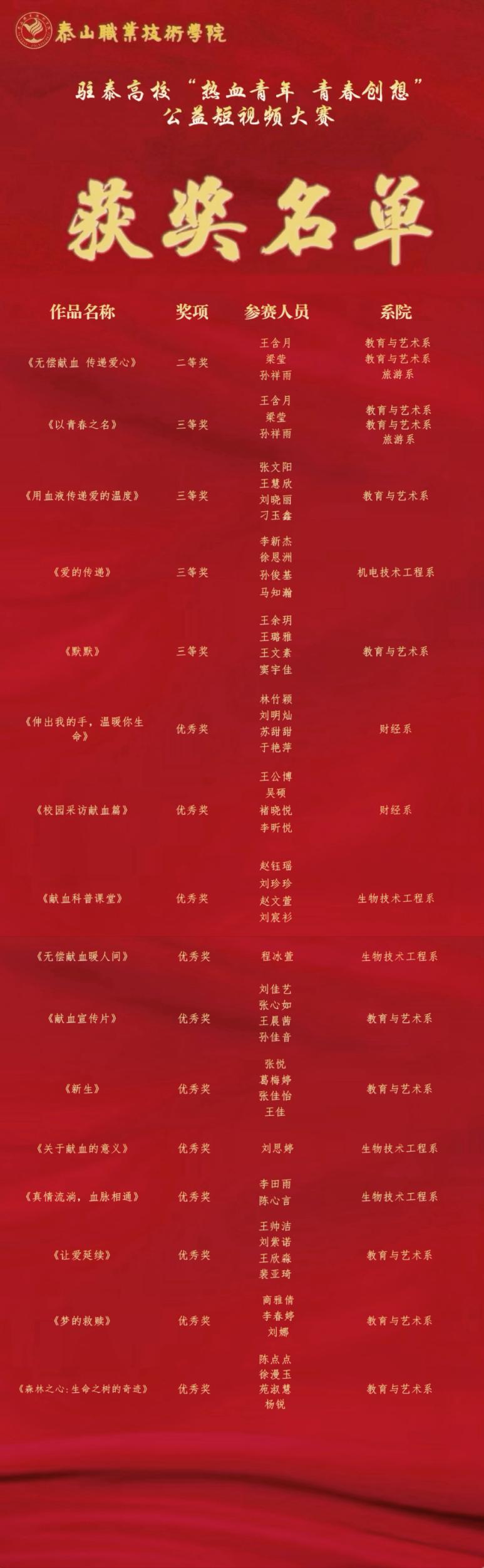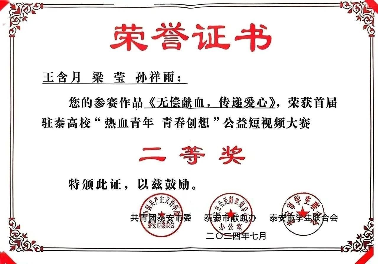 此次公益短视频大赛旨在讲好“热血泰安 大爱泰山”精彩故事,展示高校大学生“献热血 致青春”良好形象,彰显当代青年热血与担当精神。我院获奖作品主题多元,涵盖献血公益、青春梦想、社会关爱等多个方面,极具感染力和广泛的社会影响力。