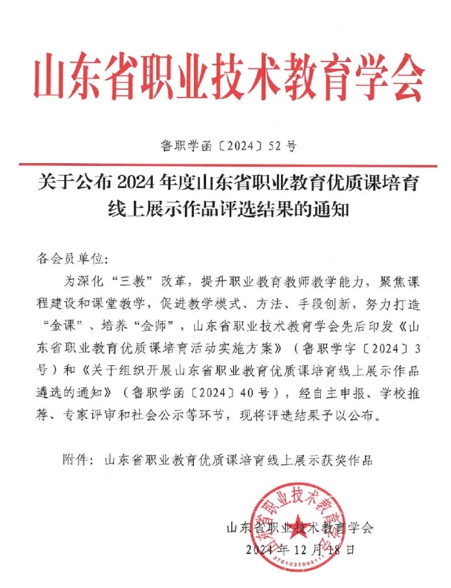 本次课程评选是山东省职业技术教育学会为深化三教改革,努力打造“金课”、培养“金师”,提升职业教育教师教学能力的一项重要举措。我校入选作品课程设计紧密贴合职业教育性质,培育学生的职业技能及综合素养,从课程内容的挑选、教学方法的运用到教学流程的组织,均体现出创新性,营造高效课堂。