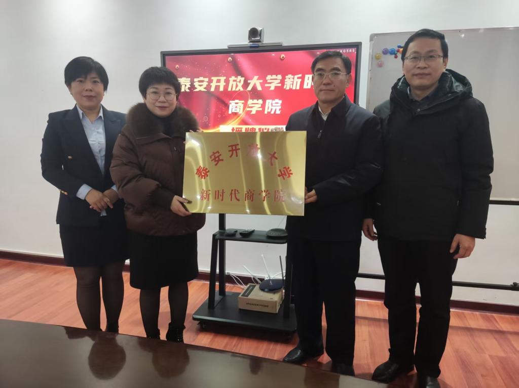 1月22日,学校党委委员、副校长陈士兵,泰安开放大学相关负责人到泰安市时代儒商经贸有限公司走访慰问,与公司董事长张海英就共建“泰安开放大学新时代商学院”进行深入探讨,并举行授牌仪式。