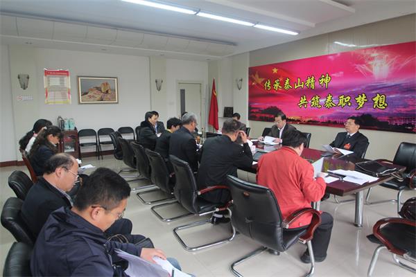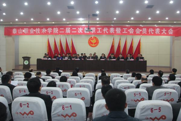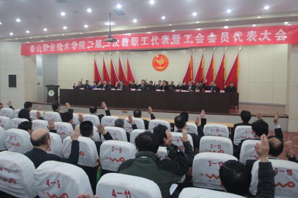 4月8日,我院在图书馆报告厅召开泰山职业技术学院二届二次教职工代表暨工会会员代表大会。泰安市总工会党组成员、副主席郭青,泰安市教育工会主席、市教育局老干部科科长张绪民,学院党委书记张勇华,党委副书记、院长毕于民,学院党委委员及教职工代表参加会议。党委副书记张清民主持会议。