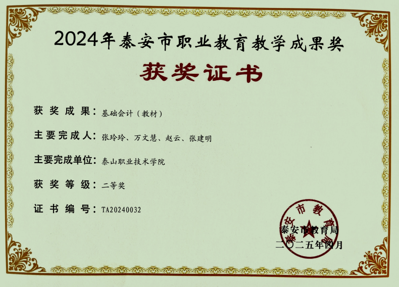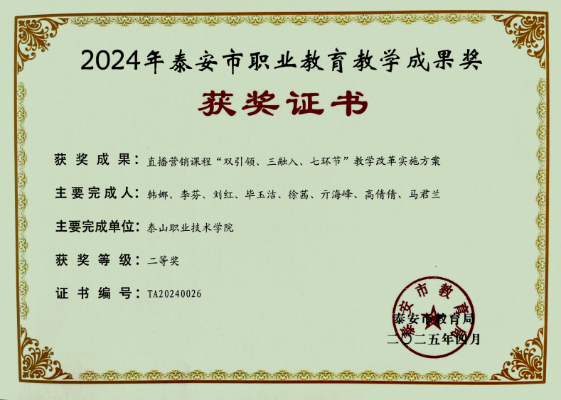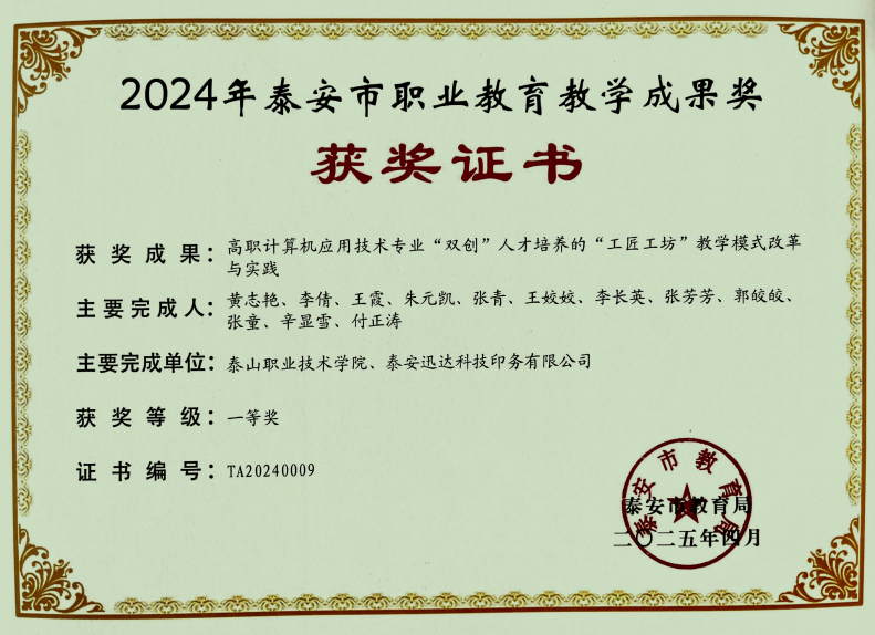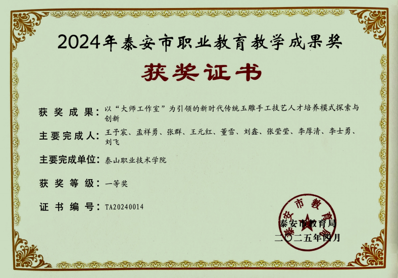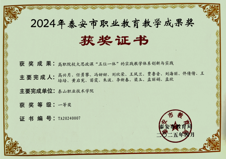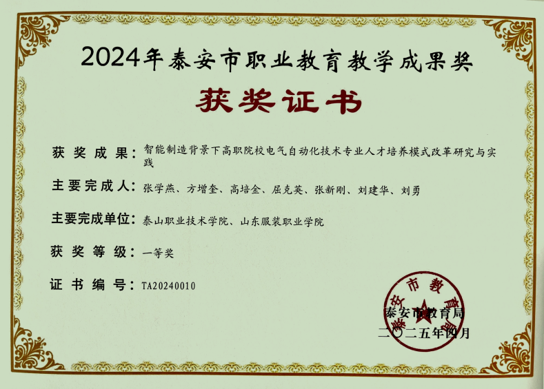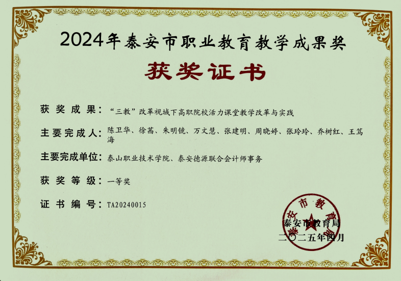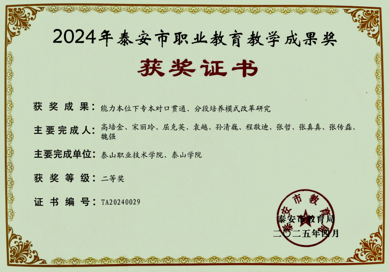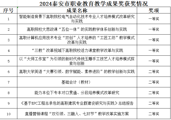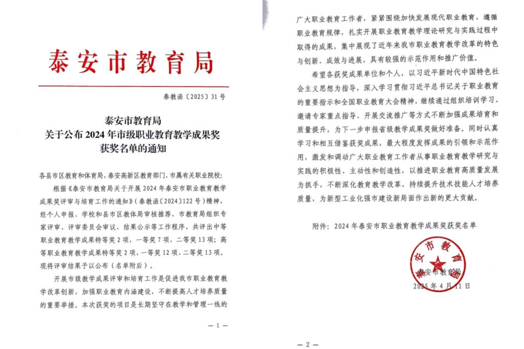 近日,泰安市教育局公布了2024年泰安市职业教育市级教学成果奖评选结果,学校提报的10个教学成果全部获奖,其中一等奖5项、二等奖5项。本次获奖体现了我校推进职业教育教学改革创新、加强职业教育内涵建设的成效。