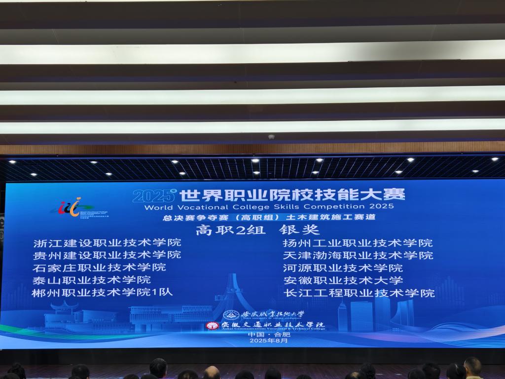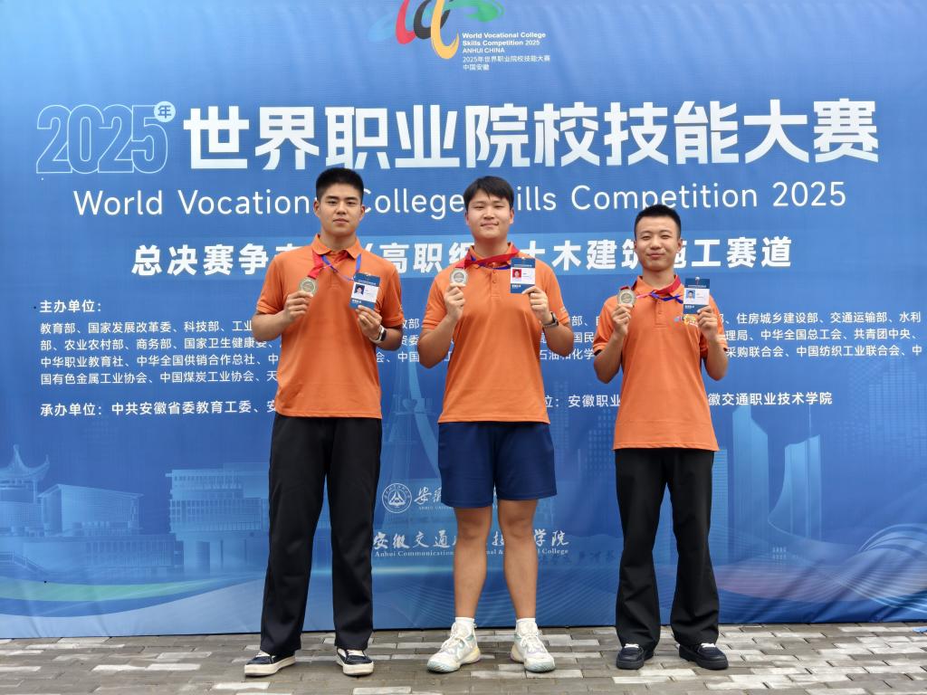 8月26日至30日,世界职业院校技能大赛土木建筑施工赛道(高职组)总决赛在安徽合肥举行。我校汽车与电气工程系高培金、史保平老师指导的刘舒畅、赵洪广、王涵三名同学,从全国155支代表队中脱颖而出,获该赛道银奖。