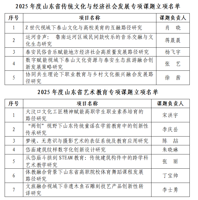 近日,山东省文化艺术科学协会公布了2025年度山东省“传统文化与经济社会发展”专项课题及“艺术教育”专项课题立项名单,学校12项课题获准立项。其中,山东省传统文化与经济社会发展专项课题5项,山东省艺术教育专项课题7项。