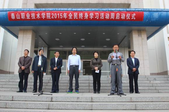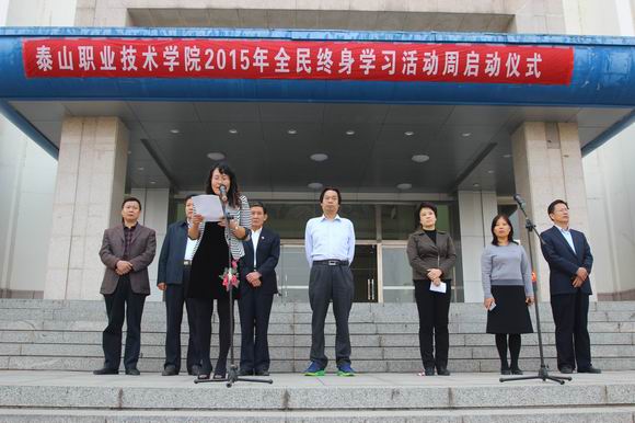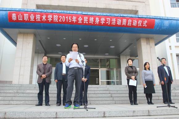 10月22日下午3:30,我院在青春广场举行2015“全民终身学习活动周”启动仪式。党委副书记张清民,党委委员、副院长张小烨,党委委员、工会主席李敬海,党委委员、办公室主任韩玮,党委委员、机关党委专职副书记田昌江,党委委员、组织人事处处长亓玉华,院长助理王元成,办公室、宣传处、教务处、学工处、基础部、图书馆、科研处、成教中心、泰山书院、各系带队主任,2015级新生及班主任辅导员共3000余人参加,张小烨主持启动仪式。